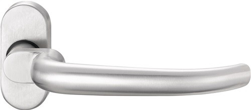 für Rahmentüren/Haustüren · gekröpft · fest-drehbar auf ovaler Rosette · mit Hochhaltefeder · Rosette Stärke 14,5 mm · Höhe 75 mm · Breite 34 mm · verdeckte Verschraubung · Anschlagrichtung DIN links / rechts · Lieferung ohne Stift und Schrauben · Weitere technische Eigenschaften Breite: 34mm • Drückerlänge: 166mm • Drückertiefe: 94mm • Stärke: 14,5mm • Anschlagrichtung: DIN links / rechts • Norm: DIN 1906 • Lagerung: fest-drehbar • Rosetten-Höhe: 75 mm