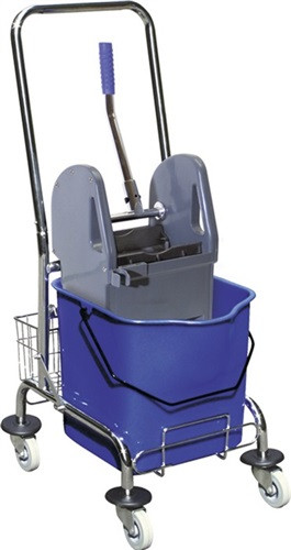 verchromter Metallrahmen mit Schubbügel und Ablagekorb · robuste Doppelbacken-Mopp-Presse · gummierte Metall-Lenkrollen · Eimer 27 l (blau) · mit Stoßfangscheiben · einfache Montage