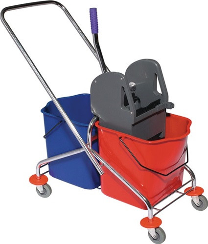 verchromter Metallrahmen mit Schubbügel · robuste Doppelbacken-Mopp-Presse · gummierte Metall-Lenkrollen · 2 Eimer, 27 l (rot, blau) · mit Stoßfangscheiben · einfache Montage