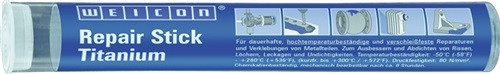 verschleißfest, titaniumgefüllt, hochtemperaturbeständig bis +280°C (kurzfristig bis +300°C) · eignet sich für dauerhafte und verschleißfeste Reparaturen und Verklebungen von Metallteilen, wie Tanks und Leitungsrohren, Aluminium-, Leichtmetall- und Spritzgussteilen, Wellen und Gleitlagern, Pumpen und Gehäusen und ausgerissenen Gewinden · kann im Maschinen- und Anlagenbau, im Behälter- und Apparatebau und in vielen anderen Bereichen der Industrie zum Einsatz kommen. Mischungsverhältnis 1:1 · pastös (knetbar) · temperaturbeständig von -50 °C bis +280 °C (kurzfristig bis +300°C) · Topfzeit: 30 Min. · handfest nach 1 Std. · mechanisch bearbeitbar nach 4 Std. · komplett durchgehärtet nach 48 Std. · Druckfestigkeit nach DIN 53281-83: 80 N/mm² · Weitere technische Eigenschaften Gebinde: Stick
