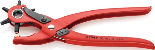 zum Stanzen von Löchern in Leder, Textil- und Kunststoffmaterial · mit 6 auswechselbaren Lochpfeifen: Ø 2,0 / 2,5 / 3,0 / 3,5 / 4,0 / 5,0 mm · aus hochfestem Stahlblech · pulverbeschichtet · mit Öffnungsfeder und Sperrklinke · Weitere technische Eigenschaften Griff: rot pulverbeschichtet • Ausführung: Öffnungsfeder • Gesamtlänge: 220mm