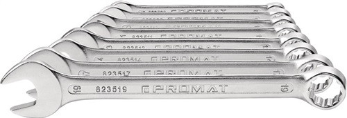 CV-Stahl · geschmiedet · verchromt · mit gleichen Schlüsselweiten · Ring und Maul 15° abgewinkelt Ringseite mit schraubenschonendem Promat- ENERGY -Profil, die Kräfte werden auf die Flächen der Schrauben und Muttern übertragen, das schont die Schrauben und das Werkzeug und ermöglicht die Übertragung hoher Drehmomente DIN 3113 / ISO 3318 Form A / ISO 7738 · Weitere technische Eigenschaften Schlüsselweite max.: 19mm • Material: CV-Stahl • Norm: DIN 3113 Form A, ISO 3318, ISO 7738 • Schlüsselweite min.: 8mm