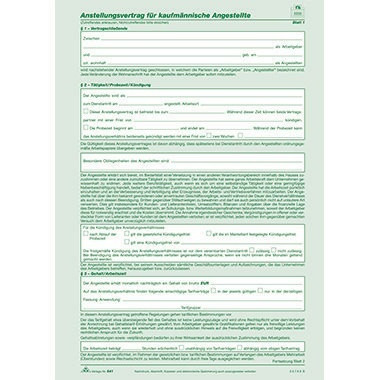 Für alle Lohnempfänger. Enthält alle Regelungen für die Beschäftigung von Lohnempfängern. Mit diesem Arbeitsvertrag für alle Gehaltsempfänger werden alle Rechte und Pflichten im Arbeitsverhältnis geregelt · Anzahl der Durchschläge: 1 Durchschlag · selbstdurchschreibend: Ja · Papierformat: DIN A4 · Verwendung für Beschriftungsart: Schreibmaschine, handschriftlich · Grammatur: 80 g/m² · Anzahl der Blätter: 2 x 2 Bl. · Abheftlochung vorhanden: Nein · Farbe: grün · Art der Verwendung: kaufmännische Angestellte