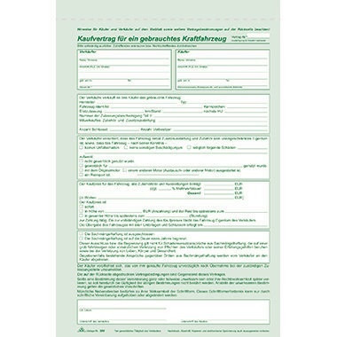 Mit diesem Kaufvertrag können nicht nur Privatpersonen, sondern auch Gewerbetreibende, Unternehmen und Freiberufler gebrauchte Fahrzeuge an Privatpersonen oder Gewerbetreibende verkaufen. Mit umfanreichen Erläuterungen, Veräußerungsanzeigen für Zulassungsstelle und Versicherung sowie Verkaufsschild · Farbe: grün · Verwendung für Beschriftungsart: Schreibmaschine, handschriftlich · selbstdurchschreibend: Ja · Papierformat: DIN A4 · Art der Verwendung: gebrauchte KFZ (gewerblich/privat) · Anzahl der Durchschläge: 1 Durchschlag · Abheftlochung vorhanden: Ja · Anzahl der Blätter: 1 x 4 Bl. · Ausführung der Lieferzusammenstellung: inkl. 1 Seite Hinweisseite, 1 Plakat "Zu verkaufen"