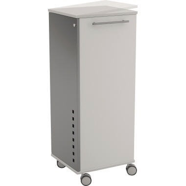 Abschließbare Metalltür im Lochblechdesign. Pulverbeschichtung der Tür in weiß aluminium. Türöffnungswinkel 270 °. Deckplatte 15 ° ausstellbar. Mit Kabelauslassdose. Griffleiste aus Edelstahl. 1 Fach für 4 Ordner DIN A. 1 Fach für die Notebookablage. 1 Schublade ( Stahlblech ) mit Utensilieneinsatz. 1 Hängeregisterauszug aus Stahlblech. Große Laufrollen 75 mm mit Feststeller. Ausziehbare Arbeitsplatte in 72 cm. Höhe (max. 24 x 36 cm Auszugfläche). Gewicht: 32 kg. · Maße: 42,4 x 118 x 47 cm (B x H x T) · Anzahl der Böden: 2 Böden · Werkstoff: Holz, melaminharzbeschichtet · Tür vorhanden: Ja · Montageart bei Lieferung: teilmontiert · Lenkrolle feststellbar: Ja · Farbe: lichtgrau · Anzahl der Türen: 1 Tür · Rollen vorhanden: Ja