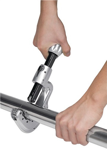 speziell entwickelt zum Schneiden von Edelstahlrohren auch geeignet für C-Stahl · kugelgelagertes Schneidrad · kugelgelagerte Führungsrollen für schnelles und leichtes Schneiden · Ersatzschneidrad mit Lager im Knauf · bis 35 mm mit Schnelleinstellung, wie abgebildet