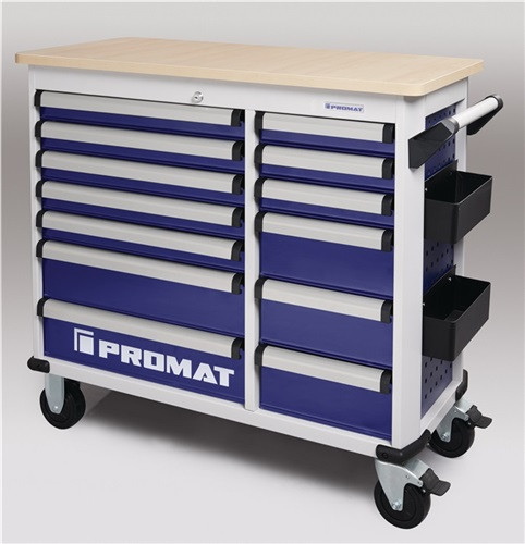 kugelgelagerte, mit Teleskopschienen herausziehbare Schubladen mit 100 % Auszug mit jeweils einer Antirutschmatte · automatischer Schubladeneinzug · robuste Ablagefläche bestehend aus einer 25 mm dicken MDF Platte · Einteilerset für 4 Schubladen im Lieferumfang enthalten · abschließbar mittels eingebauten Zylinderschloss mit 4 Schlüsseln · hochwertige PVC-Rollen - 2 starre und 2 lenkbare Rollen mit Feststellung · beidseitiges Lochwandsystem (9 x 9 mm) · für einfache Installation von Zubehörartikel · 2 Dosenhalter mit Lochung für Schraubendreher (im Lieferumfang enthalten) · Kantenschutz an den unteren Ecken Maß über alles aufgebaut mit Griff und Rädern (B x T x H) 1150 x 500 x 1015 mm Maß nur Korpus (B x T x H) 1042 x 459 x 817 mm Innenmaß Schubladen (B x T x H) 5 x 568 x 398 x 75 mm, 2 x 568 x 398 x 154 mm, Innenmaß Schubladen (B x T x H) 3 x 301 x 398 x 75 mm, 3 x 301 x 398 x 154 mm Tragkraft pro Schublade 30 kg / statische Gesamtbelastbarkeit 500 kg