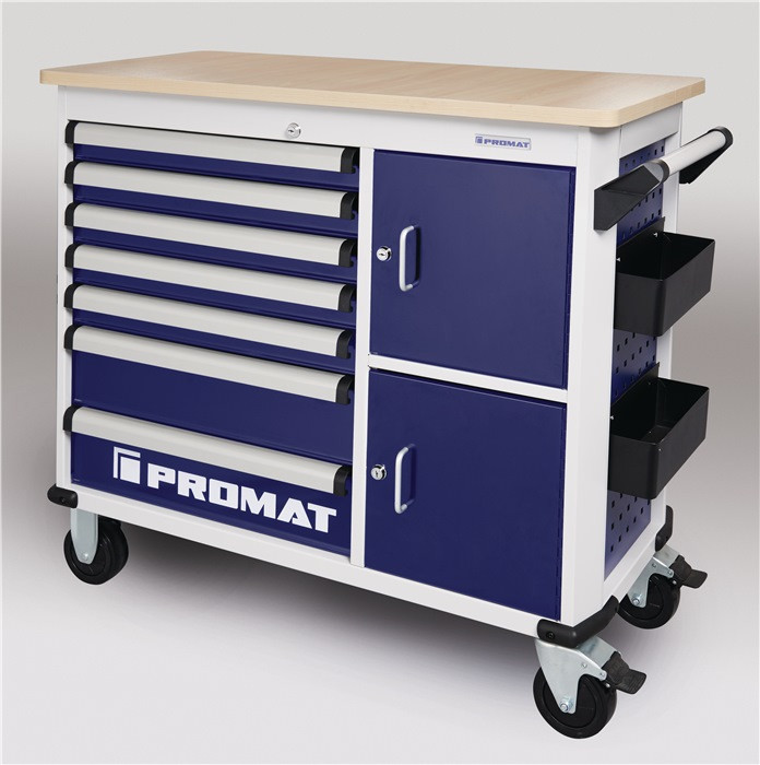 kugelgelagerte, mit Teleskopschienen herausziehbare Schubladen mit 100 % Auszug mit jeweils einer Antirutschmatte · automatischer Schubladeneinzug · robuste Ablagefläche bestehend aus einer 25 mm dicken MDF Platte · Einteilerset für 4 Schubladen im Lieferumfang enthalten · abschließbar mittels eingebauten Zylinderschloss mit 4 Schlüsseln · hochwertige PVC-Rollen – 2 starre und 2 lenkbare Rollen mit Feststellung · beidseitiges Lochwandsystem (9 x 9 mm) · für einfache Installation von Zubehörartikel · 2 Dosenhalter mit Lochung für Schraubendreher (im Lieferumfang enthalten) · Kantenschutz an den unteren Ecken Maß über alles aufgebaut mit Griff und Rädern (B x T x H) 1150 x 500 x 1015 mm Maß nur Korpus (B x T x H) 1150 x 500 x 1015 mm Innenmaß Schubladen (B x T x H) 5 x 568 x 398 x 75 mm, 2 x 568 x 398 x 154 mm Tragkraft pro Schublade 30 kg / statische Gesamtbelastbarkeit 500 kg · Lieferung ohne Werkzeuge/Inhalt