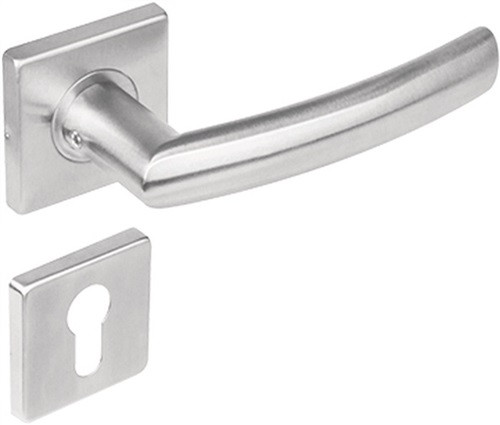 für Zimmertüren · Gehrungsdrücker gebogen · flachrund · Drückerrosette mit Hochhaltefeder · quadratische Rosetten 53 x 53 mm, mit Nocken · Rosetten-Stärke 8 mm · mit 8 mm Vierkantstift und Befestigungsschrauben für Türstärken bis 42 mm · Drückerlänge 132 mm · Drückergarnitur · DIN links / rechts · Weitere technische Eigenschaften Drückerlänge: 132mm • Befestigungssystem: Standardstift • Ergänzung: D/D • Drückertiefe: 63mm • Nockenabstand: 38mm • Farb-Nr.: 304 • Norm: DIN 1906