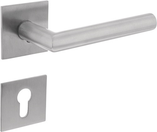 für Zimmertüren · Gehrungsdrücker L-Form · Drücker-Ø 20 mm · quadratische Rosetten 55 x 55 mm · Magnetrosetten , mit Nocken · Rosetten-Stärke 3 mm · mit 8 mm Vierkantstift und Befestigungsschrauben für Türstärken bis 42 mm · Drückerlänge 136 mm · Drückergarnitur · DIN links / rechts · Weitere technische Eigenschaften Drückerlänge: 136mm • Befestigungssystem: Standardstift • Ergänzung: D/D • Drückertiefe: 60mm • Nockenabstand: 38mm • Farb-Nr.: 304 • Norm: DIN 1906