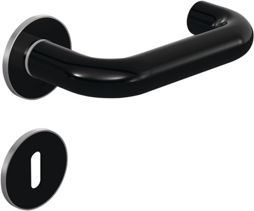 BiColor · Zimmergarnitur mit Schlüsselrosetten und mit flachen Rosetten nach DIN 18255 und DIN EN 1906 und Inlay aus farbigem Polyamid, bestehend aus: Türdrücker Modell 111.23P... in U-Form aus Polyamid hochglänzend · mit durchgehendem Stahlkern bis in das Drückerende · durchgängig eingefärbt · Drücker-Ø 23 mm, mit Ansatzführung und Gewindestift M5 als zusätzliche Fixierung der Türdrücker mit dem Vierkantstift zur optimalen Kraftübertragung in das Türblatt · der Drücker erfüllt die Vorgaben der DIN 18040 · Flache Drücker- und Schlüssel-Rosetten, 305... und 306.23XI..., rund, Rosetten-Ø 52 mm, 4,0 mm hoch · Verdeckte, lockerungssichere Verbindung: Drücker und Rosetten sind festdrehbar vormontiert, sowie in das Türblatt eintauchende Stützzapfen · Einfache und schnelle Montage durch Einrasten vormontierter Baugruppen · Material der Rosetten Edelstahl (1.4301), in matt od. spiegelpoliert oder in PVD-Beschichtung · Rosetteneinleger aus Polyamid hochglänzend · Ausgelegt und geprüft für den Objektbereich, Gebrauchskategorie nach DIN EN 1906 - Klasse 4 · Drückergarnitur · DIN links / rechts verwendbar · Vierkant: 8 mm · Weitere technische Eigenschaften Drückerlänge: 150mm • Ergänzung: D/D • Drückertiefe: 69mm • Farb-Nr.: 90-90-XA • Norm: DIN 1906
