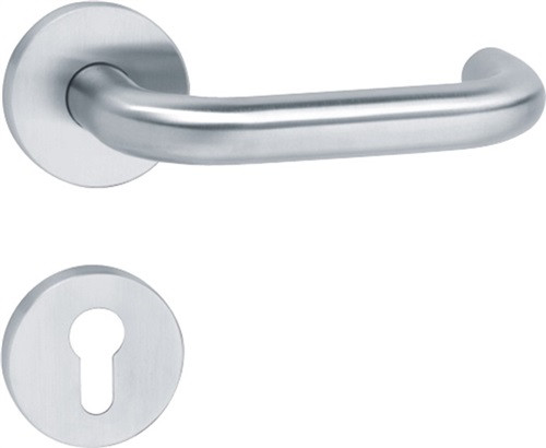 in B-Technik mit Rosetten nach DIN 18255 und DIN EN 1906 aus Edelstahl, bestehend aus: Türdrücker Modell 111X aus Edelstahlrundrohr (1.4301), Durchmesser 21,3 mm mit 1,5 mm Wandstärke, mit Ansatzführung und Rastnut, mit Madenschraube M5. Montage durch einfaches Einrasten der Türdrücker in die auf der Tür vormontierten Unterteile. Die Rastung kann mittels Demontageschlüssel wieder gelöst werden. Der Drücker erfüllt die Vorgaben der DIN 18040. Oberfläche matt geschliffen Rosettenunterkonstruktion in Kunststoffverbundbau, integriertes Hochhaltemodul mit Federunterstützung, DIN links und DIN rechts verwendbar. Festdrehbarlagerung der Drücker mit selbsttätig einrastender Rundumverriegelung und 5 mm Lagerstelle als wartungsfreies Gleitlager mit elastischem Ausgleichsbereich. Verdeckte, lockerungssichere Verschraubung mit 5 mm Spaxschrauben sowie Stützzapfen. Rosetten-Abdeck-Kappe, rund, aus Edelstahl (1.4301), Durchmesser 55 mm, 10,5 mm hoch, 1,5 mm Wandstärke. Ausgelegt und geprüft für den Objektbereich, Benutzerkategorie nach DIN EN 1906 - Klasse 3 Garnitur mit Vierkantstift 8 mm · Drückerlänge 144 mm · Drückergarnitur · Weitere technische Eigenschaften Drückerlänge: 144mm • Befestigungssystem: B-Technik • Ergänzung: D/D • Drückertiefe: 65mm • Nockenabstand: 38mm • Farb-Nr.: XA • Norm: DIN 1906