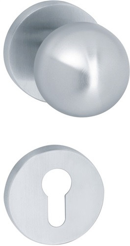 in B-Technik mit Rosetten nach DIN 18255 und DIN EN 1906 aus Edelstahl, bestehend aus: Knopf Modell 109X aus Edelstahl und Türdrücker Modell 111X aus Edelstahlrundrohr (1.4301), Durchmesser 21,3 mm mit 1,5 mm Wandstärke, mit Ansatzführung und Rastnut, mit Madenschraube M5 als zusätzliche Fixierung. Montage durch einfaches Einrasten der Türdrücker in die auf der Tür vormontierten Unterteile. Die Rastung kann mittels Demontageschlüssel wieder gelöst werden. Der Drücker erfüllt die Vorgaben der DIN 18040. Oberfläche matt geschliffen Rosettenunterkonstruktion in Kunststoffverbundbau, integriertes Hochhaltemodul mit Federunterstützung, DIN links und DIN rechts verwendbar. Festdrehbarlagerung der Drücker mit selbsttätig einrastender Rundumverriegelung und 5 mm Lagerstelle als wartungsfreies Gleitlager mit elastischem Ausgleichsbereich. Verdeckte, lockerungssichere Verschraubung mit 5 mm Spaxschrauben sowie Stützzapfen. Rosetten-Abdeck-Kappe, rund, aus Edelstahl (1.4301), Durchmesser 55 mm, 10,5 mm hoch, 1,5 mm Wandstärke. Wechselgarnitur vorgerichtet für PZ Ausgelegt und geprüft für den Objektbereich, Benutzerkategorie nach DIN EN 1906 - Klasse 3 Garnitur mit Vierkantstift 8 mm, für Türstärke 38-48 mm · Drückerlänge 144 mm · Wechselgarnitur · Weitere technische Eigenschaften Drückerlänge: 144mm • Befestigungssystem: B-Technik • Ergänzung: D/K • Drückertiefe: 65mm • Knopf: Kugel • Nockenabstand: 38mm • Farb-Nr.: XA • Norm: DIN 1906