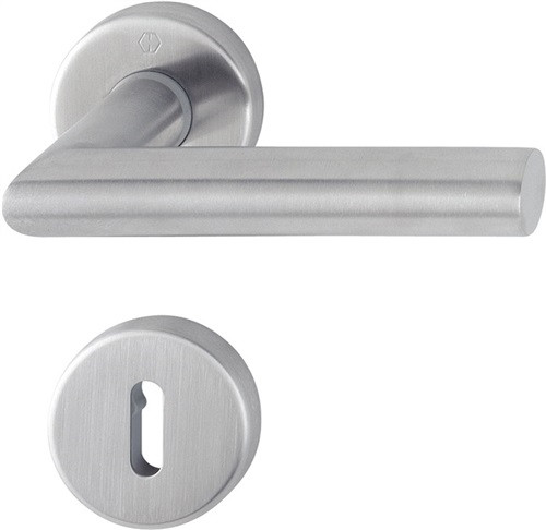 Innentür-Rosetten-Garnitur geprüft nach DIN EN 1906 (Benutzer-Kategorie 3) · Edelstahl, matt · Türgriffe mit Schnellstift-Verbindung (mit 8 mm Vollstift) für Türstärke 37-42 mm · Rosetten mit Kunststoff-Unterkonstruktion, Rückholfeder und Stütznocken · verdeckte, durchgehende Verschraubung mit selbstschneidenden Gewindeschrauben · Anschlagrichtung DIN links / rechts · Weitere technische Eigenschaften Drückerlänge: 125mm • Befestigungssystem: Schnellstift • Ergänzung: D/D • Drückertiefe: 59mm • Nockenabstand: 38mm • Farb-Nr.: F69 • Norm: DIN 1906