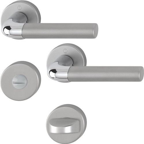 Innentür-Rosetten-Garnitur geprüft nach DIN EN 1906 (Benutzerkategorie 3) · Türgriffe mit Schnellstift-Verbindung (8 mm Vierkant) für Türstärke 37-42 mm und Rückholfeder · Rosetten mit Stütznocken unsichtbar verschraubt · Messing verchromt glänzend / Aluminium Stahl matt · Drückergarnitur · Anschlagrichtung DIN links / rechts · Weitere technische Eigenschaften Drückerlänge: 132mm • Befestigungssystem: Schnellstift • Ergänzung: D/D • Drückertiefe: 54mm • Nockenabstand: 38mm • Farb-Nr.: F49/F9-2 • Norm: DIN 1906