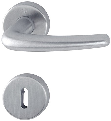 Edelstahl-Innentür-Rosetten-Garnitur (Türgriff Garnitur) · DIN geprüft · Türgriff mit Schnellstift-Verbindung · Rosetten mit Kunststoff-Unterkonstruktion · Rückholfeder und Stütznocken · verdeckte, durchgehende Verschraubung mit selbstschneidenden Gewindeschrauben · Vierkant 8 mm · für Türstärke 37 - 42 mm · Anschlagrichtung DIN links / rechts · Wechselgarnitur: mit Knopf E58 · Weitere technische Eigenschaften Drückerlänge: 130mm • Befestigungssystem: Schnellstift • Ergänzung: D/D • Drückertiefe: 65mm • Nockenabstand: 38mm • Farb-Nr.: F69 • Norm: DIN 1906