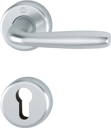 Innentür-Rosetten-Garnitur geprüft nach DIN EN 1906 (Benutzer-Kategorie 3) · Türgriffe mit Schnellstift-Verbindung (mit 8 mm Vollstift) für Türstärke 37 - 42 mm · Rosette mit Kunststoff-Unterkonstruktion, Rückholfeder und Stütznocken · Befestigung: verdeckt, durchgehend, wechselseitig · inkl. Mehrzweckschrauben · Anschlagrichtung DIN links / rechts · Drückergarnitur · Weitere technische Eigenschaften Drückerlänge: 115mm • Befestigungssystem: Profilstift • Ergänzung: D/D • Drückertiefe: 53mm • Nockenabstand: 38mm • Farb-Nr.: F1 • Norm: DIN 1906
