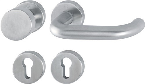 Innentür-Rosetten-Garnitur geprüft nach DIN EN 1906 (Benutzer-Kategorie 3) · Türgriffe mit Schnellstift-Verbindung (mit 8 mm Vollstift) für Türstärke 37-42 mm · Rosetten mit Kunststoff-Unterkonstruktion, Rückholfeder und Stütznocken · verdeckte, durchgehende Verschraubung mit selbstschneidenden Gewindeschrauben · Anschlagrichtung DIN links / rechts · Weitere technische Eigenschaften Drückerlänge: 141mm • Befestigungssystem: Schnellstift • Ergänzung: D/K • Drückertiefe: 67mm • Knopf: flach • Nockenabstand: 38mm • Farb-Nr.: F69 • Norm: DIN 1906