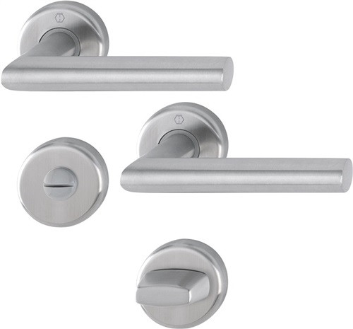 Innentür-Rosetten-Garnitur · Türgriffe mit Profilstift-Verbindung (8 mm Vierkant) für Türstärke 38-42 mm und Rückholfeder · Rosetten mit Stütznocken unsichtbar verschraubt · Anschlagrichtung DIN links / rechts · Weitere technische Eigenschaften Drückerlänge: 125mm • Befestigungssystem: Schnellstift • Ergänzung: D/D • Drückertiefe: 58mm • Nockenabstand: 38mm • Farb-Nr.: F69 • Norm: DIN 1906