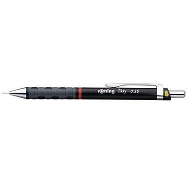 Technik zur Minenrestreduzierung vorhanden, mit farbig abgesetzter 2 Komponenten-Griffzone für die rutschfeste ergonomische Tikky-Welle. · ISO-Kennzeichnung vorhanden: Ja · Technik zur Minenrestreduzierung vorhanden: Ja · Stärke der Mine: 0,35 mm · Spitze voll versenkbar: Nein · Radierer vorhanden: Ja · Radierer auswechselbar: Ja · Mine federnd gelagert: Ja · Ausführung der Griffzone: gummiert, gewellt · Material des Schaftes: Kunststoff · Farbe des Schaftes: schwarz · Clip vorhanden: Ja · Bezeichnung der Härte: HB · Ausführung der Vorschubmechanik: Druckmechanik · Mine auswechselbar: Ja