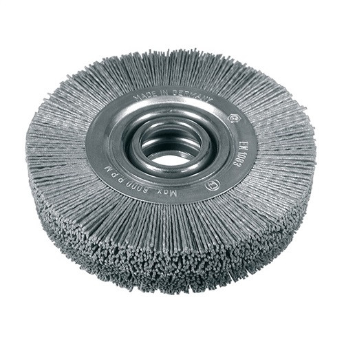 Schleifnylon-Rundbürste mit Siliciumcarbid für die Fertigbearbeitung · zum Einsatz auf Polierbockmaschinen und CNC-Maschinen · Vorzüge: gleichmäßige Schleifwirkung, da sich bei der Abnutzung des Trägermaterials ständig neues Schleifmaterial freisetzt hohe Elastizität und Flexibilität ohne Bruchgefahr kein Zusetzen der Besatzfläche mit Arbeitsrückständen für Nass- und Trockenarbeit geeignet, da Nylon keine bedeutenden Mengen an Kühl- oder Schmiermittel absorbiert beständig gegen schwache Säuren und Laugen kein Nachschneiden des Besatzes bei normaler Anwendung erforderlich hohe Standzeit bei optimalen Voraussetzungen entsprechende Drehzahl (22 m/sek) geringer Anpressdruck geringe Wärmeentwicklung Anwendungsbereiche: Entfernen von leichtem Rost bei Autokarosserien Entgraten und Feinschleifen von Lamellen, Leiterplatten und gedruckten Schaltungen Entgraten von Schnitt- und Stanzgraten Kunststoff, Aufrauen und Mattieren Schleifen von Holz und Sperrholz · Weitere technische Eigenschaften Körnung: 120mm • Material: Nylon • max. Drehzahl: 9000min-¹
