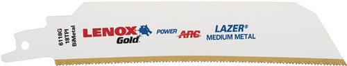 zum anspruchsvollen Einsatz in Metall · aggressiveres Blattdesign optimiert den Schnittwinkel für schnelles Schneiden in unterschiedlichsten Materialien · Power Arc Technology liefert 2 x längere Lebenszeit gegenüber einem herkömmlichen LENOX Sägeblatt · Titanium Nitride liefert stärkere Widerstandskraft, das Blatt bleibt länger scharf und hält länger · passend für alle Säbelsägen der Fabrikate AEG, Bosch, Festo, Makita, Metabo, Flex, DeWalt, Black & Decker, Hitachi, REMS, Roller, Skil · Weitere technische Eigenschaften St. je Karte: 5 • Typ: 6118G