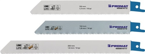 3er Sortiment Säbelsägeblätter · passend für Säbelsägen der Fabrikate AEG, DeWalt, Bosch, Flex, Hitachi, Makita, Metabo, REMS, Roller, Milwaukee · Weitere technische Eigenschaften Inhalt: 3-teilig • Verpackung: Kunststofftasche • bestehend aus: je 1 x 40 00 814 716 / je 1 x 40 00 814 717 / je 1 x 40 00 814 712