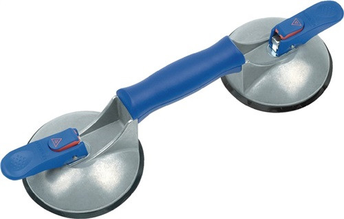 2-Kopf-Aluminium-Körper · für diverse Lasten mit zusätzlicher Dichtlippe · auch für leicht gewölbte oder strukturierte Oberflächen · Ansaugen durch Umlegen der Kipphebel · geeignet für alle Materialien mit gasdichten Oberflächen wie Glas, Kunststoffplatten, Blech, beschichtetes Holz, Marmor, Fliesen etc. · Gummischeiben auswechselbar · senkrecht · mit Vakuumanzeige