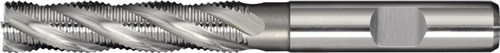 mit Feinschruppverzahnung · HSS-Co5 · DIN 844 · Typ HR · Vierschneider · lang · 45° Schutzfase · Zentrumschnitt · hinterschliffenes feines Kordelprofil · Zylinderschaft mit Mitnahmefläche · rechtsschneidend · zum Fräsen von Werkstoffen mit Festigkeit bis ca. 800 N/mm² · Weitere technische Eigenschaften Schaft-Ø: 12mm • Freischliff: 11,5mm