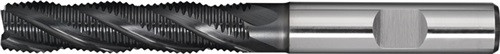 mit Feinschruppverzahnung · HSS-PM · ALCRONA-beschichtet · DIN 844 · Typ HR · Vierschneider · lang · 45° Schutzfase · Zylinderschaft mit Mitnahmefläche · rechtsschneidend · zum Fräsen von Werkstoffen bis ca. 1400 N/mm² Festigkeit · verbesserte Werkzeugsteifigkeit durch konischen Spannutengrund · Weitere technische Eigenschaften Schaft-Ø: 20mm • Freischliff: 19mm