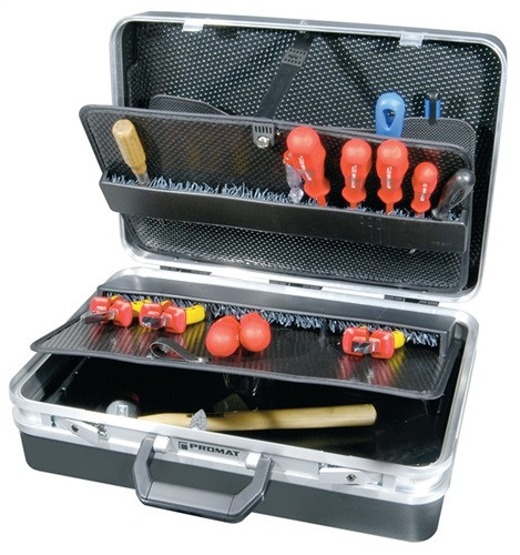 abschließbar · Schalen aus schlagfestem ABS-Kunststoff schwarz · Aluminiumrahmen · stabiler Griff · geschraubte Griffleiste mit integrierten Kippschlössern · eine Werkzeugtafel mit 2 individuell bestückbaren Werkzeughaltern für Werkzeuge von 11 - 15 mm Ø auf Vorder- und Rückseite · 1 Dokumentenfach im Deckel · unterteilbare Bodenschale mit Abdeckplatte mit individuell bestückbarem Werkzeughalter für Werkzeuge bis 26 mm Ø · Tragfähigkeit 20 kg Besondere Produktvorteile: Werkzeugtafeln aus Kunststoffwabenmaterial · beständig gegen Flüssigkeit und Feuchtigkeit · leicht, knickstabil und abriebfest (keine Pappe) · mit CP-7-Stecksystem