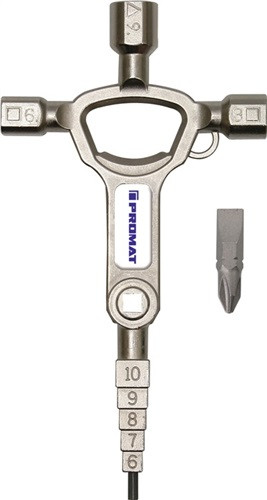 für alle gängigen Absperrsysteme der Gas-, Wasser- und Elektrizitätsversorgung sowie für technische Anlagen in Gebäuden wie Klima- und Belüftungsanlagen, Absperrventile, Netzschalttafeln usw. · mit Flaschenöffner-Funktion Funktionen: 1. Innensechskantschlüssel 3 mm 2. Innenvierkant 5 mm 3. Innenvierkant 6 mm 4. Innenvierkant 8 mm 5. Innendreikant 9 mm 6. stufiger Vierkant 6-10 mm Wendebit: für Kreuz (PH 2) + Schlitz 1 x 7 mm 7. magnetische Bitaufnahme 6,3 mm (1/4") · Weitere technische Eigenschaften Breite: 75mm • Länge: 145mm • Material: Zink-Druckguss • Höhe: 10mm
