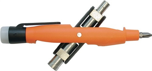 mit berührungslosem Spannungsprüfer und Magnetfeldtester · für alle gängigen Schaltschrank-Schließungen · 6,3mm (1/4") Bitaufnahme mit Dauermagnet · mit Hemdclip Funktionen: 1. Innenvierkant 6 mm 2. Innenvierkant 7 - 8 mm 3. Innendreikant 9 mm 4. Doppelbart 3 - 5 mm 5. Doppelbit Kreuz 1,2 x 7 mm / PH2 6. rote LED zur Spannungsanzeige 7. grüne LED zur Magnetfeldanzeige Anwendungsbereiche: Pneumatik- und Hydrauliksysteme, Magnetventile in Automobil- und Maschinenbereich, Magnetventile der Ölheizung, berührungsloses Aufspüren von Dauermagneten · Weitere technische Eigenschaften Breite: 28mm • Länge: 158mm • Höhe: 22mm