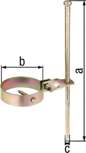 SB-verpackt · ein Set bestehend aus einer Schelle, einem Erdnagel und einer Schlüsselschraube · Material: Stahl roh · Oberfläche: galvanisch gelb verzinkt · Einzelteile durch Kabelbinder verbunden · Weitere technische Eigenschaften Oberfläche: galvanisch gelb verzinkt • Maß b Ø: 100mm • Maß a: 400mm • Maß c Ø: 12mm