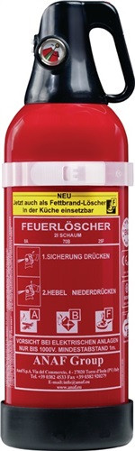2 l Schaum-Feuerlöscher · Dauerdruckbehälter mit Manometer · Rating 8A, 70B, 25F (= 2 Löschmitteleinheiten) · ideal für Entstehungsbrände im Haushalt · geringe Verunreinigung und einfache Reinigung des Brandumfeldes · zum Löschen von Fettbränden geeignet · inklusive stabiler Kfz-/Wandhalterung · erfüllt die Anforderungen der EN3 · Weitere technische Eigenschaften Ausstattung: mit Manometer, mit Halter