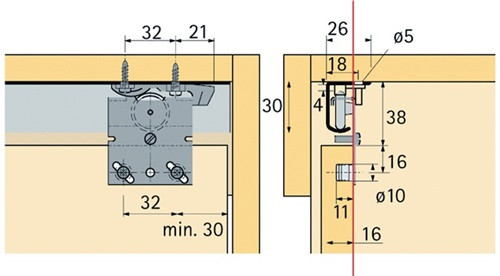 oberer Türlauf · leichter und geräuscharmer Lauf durch beidseitig gelagerte Kunststoffrollen · eine Sicherungsschraube verhindert das ungewollte Aushängen der Tür · Anschläge bremsen die Türen ab und die Tür wird in der Endlage geschlossen gehalten · die Türen bei Top Line 27 werden durch Abstandhalter mit Dämpfer auf seitlichen Mindestabstand voneinander gehalten · Belastbarkeit max. 25 kg/Tür · Türbreite ab 500 mm · Höhenverstellung der Türen ± 1,5 mm · Weitere technische Eigenschaften Anzahl Laufbahnen: 2