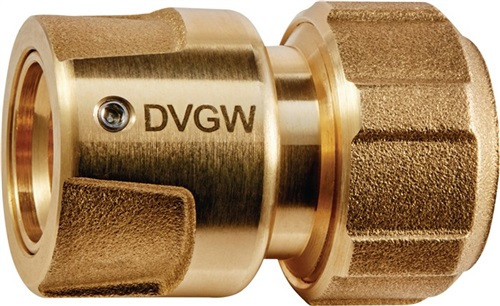 Stecksystem KTW · Messing · für Trinkwasser · geprüft und zertifiziert: DVGW VP550, DVGW W270, KTW Leitlinie · DVGW-Baumusterprüfzertifikat, Registriernummer DW-0310BT0218 · Schlauchstück kann durch einfaches Klicken angeschlossen und durch das Zurückziehen des beweglichen Teils ganz leicht wieder gelöst werden