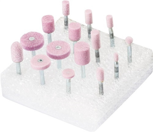 geeignet für Feinschliff · keramische Bindung (V) · Edelkorund rosa (AR) · Härte O · in Pappschachtel · Inhalt je 2 Stück in mm: Zylinderform 5x10, 8x10, 16x4 Inhalt je 1 Stück in mm: Zylinderform 4x8, 6x13, 8x2, 10x13, 13x3 Walzenrundform 5x10 Kugelform 5 Spitzbogenform 3x6, 8x16 · Weitere technische Eigenschaften Inhalt: 15 teilig