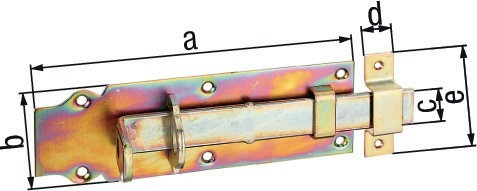 mit flachem Griff mit versenkten Schraublöchern · Material: Stahl, Oberfläche: galvanisch gelb verzinkt · Ausführung: gerade , mit befestigter Schlaufe · Weitere technische Eigenschaften Oberfläche: galvanisch gelb verzinkt • Maß c: 16mm • Maß d: 13mm • Form: gerade • Maß e: 45mm • Maß a: 100mm • Maß b: 44mm