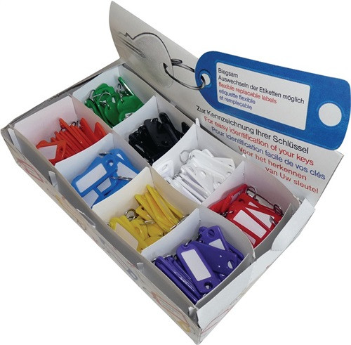 aus Weichplastik, mit S-Haken · mit großem Aufhängeloch · mit Beschriftungsstreifen und Klarsichtabdeckung · farbig sortiert · 200 Stück im Schaukasten