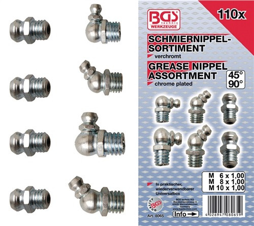Werkzeugstahl (A3), verzinkt · Größen: M6 x 1,00 Gerade = 60 St. / M6 x 1,00 45° = 5 St. / M6 x 1,00 90° = 5 St. / M8 x 1,25 Gerade = 10 St. / M8 x 1,25 45° = 5 St. / M8 x 1,25 90° = 5 St. / M10 x 1,50 Gerade = 10 St. / M10 x 1,50 45° = 5 St. / M10 x 1,50 90° = 5 St.