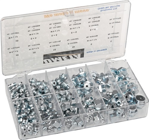 Stahl, glanzverzinkt und passiviert · M6, M8, M10, 3 mm (R 1/8"), 6 mm (1/4") · in Box · Inhalt: 40 St. H1 M6 x 1, 30 St. H1 M8 x 1, 20 St. H1 M10 x 1, 15 St. H1 R 1/8", 10 St. H1 R 1/4", 5 St. H2 M6 x 1, 5 St. H2 M8 x 1, 5 St. H2 M10 x 1, 5 St. H2 R 1/8", 5 St. H3 M6 x 1, 5 St. H3 M8 x 1, 5 St. H3 M10 x 1, 5 St. H3 R 1/8", 5 St. M1 M10 x 1, 5 St. M1 G 1/8", 5 St. M1 G 1/4"