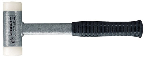 mit auswechselbaren, verschleißfesten Nylon-Schlagköpfen · kein Absplittern, geräuscharm · austauschbar · mit hoher Schlagzähigkeit · das Stahlmittelstück besitzt einen geschlossenen Hohlraum, der zum Teil mit Stahlschrot gefüllt ist · beim Aufschlag wird das Schrot zur Schlagseite geschleudert und bewirkt das rückschlagfreie Schlagen · Schlagwirkung um bis zu 100 % größer als bei normalen Schonhämmern · mit Stahlrohrstiel und Gummihandgriffüberzug · Anwendungsbereiche: Montage-/ Reparaturarbeiten im Kfz-Bereich, Fügen von Werkstücken, Positionieren von Werkstücken im Schraubstock, Karosseriebau, Reparatur-/ Instandhaltungsarbeiten, Richtarbeiten, Gehäusemontage, Montage scharfkantiger Werkstücke, Blechbearbeitung, Anlagenbau · Weitere technische Eigenschaften Gewicht: 690g • Kopflänge: 110mm • Einsätze: Nylon weiß • Schlag: hart • Stiel: Stahlrohr • Gesamtlänge: 295mm