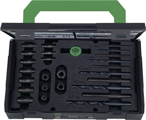 zum Ausdrehen abgebrochener Schrauben und Bolzen · komplett mit Schraubenausdrehern, HSS-Spiralbohrern und Bohrer-Führungsbüchsen für das problemlose Anbohren auch tief in Gewindelöchern abgebrochener Teile · Inhalt: je 1 Stück: Aufsteckmutter SW 10 mm, SW 11 mm, SW 13 mm, SW 14 mm, SW 17 mm Profilstift 3,2mm, 4,8 mm, 6,4 mm, 8,0 mm, 8,7 mm HSS-Spiralbohrer 3,2 mm, 4,8 mm, 6,4 mm, 8,0 mm, 8,6 mm Bohrbüchse 6 mm / 3,2 mm, 8 mm / 3,2 mm, 9 mm / 3,2 mm, 10,0 mm / 3,2 mm Bohrbüchse 10 mm / 4,8 mm, 11 mm / 4,8 mm, 12 mm / 4,8 mm, 13 mm / 4,8 mm Bohrbüchse 13 mm / 6,4mm, 14 mm / 6,4 mm Kasten mit Einlage
