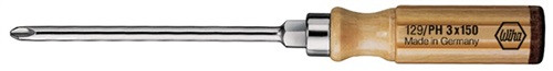 mit Holzheft · Klinge aus Chrom-Vanadium-Molybdän-Stahl · glanzvernickelt · mit 6kant-Ansatz für Schraubenschlüssel · mit Lederkappe für Schrauben mit Kreuzschlitz (PH)