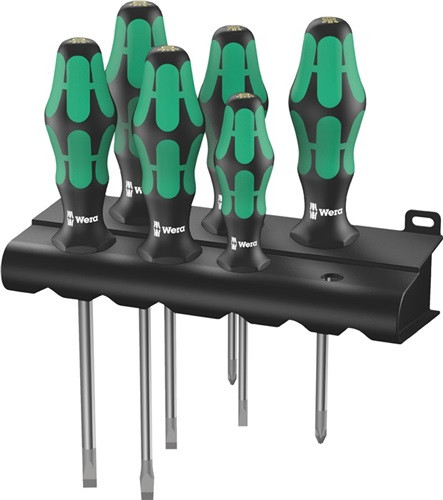 mit ergonomischen Mehrkomponenten-Kraftform-Heften mit Abrollschutz · mit harten Griffzonen für hohe Arbeitsgeschwindigkeit und weichen Griffzonen für hohe Drehmomentübertragung · Klingen aus Molybdän-Vanadium-Stahl · nicromatt mit Lasertip-Spitze · "beißt" sich im Schraubenkopf fest und verhindert ein Herausrutschen aus dem Schraubenkopf und schützt vor teuren Ausrutschern · es entfällt der größte Teil des benötigten Anpressdrucks · unverlierbares Größenleitsystem am Griffende als zeitsparende Erkennungshilfe für die jeweilige Schraubenart Inhalt: je 1 Schraubendreher für Schlitzschrauben , 3,0 x 80 mm, 4,0 x 100 mm, 5,5 x 125 mm, 6,5 x 150 mm je 1 Schraubendreher für Schrauben mit Kreuzschlitz, (Ausführung siehe Tabelle) Gr. 1/80 mm, 2/100 mm