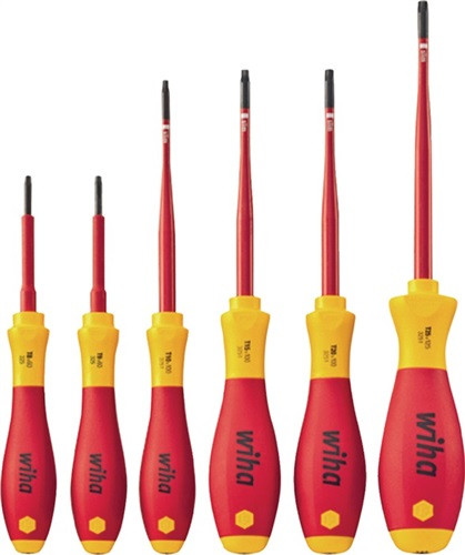 mit SoftFinish® Mehrkomponentengriffen mit Abrollschutz · gefertigt gem. IEC 60900:2012 · stückgeprüft bei 10000 Volt im Wasserbad · Klingenisolierungen direkt auf die Klingen gespritzt* · Klingen aus hochlegiertem CV-Stahl · durchgehend gehärtet · Schneiden und Spitzen brüniert für Schrauben mit Innen-TORX®-Profil Besondere Produktvorteile*: Durch die direkt auf die Klinge gespritzte Schutzisolation, die im vorderen Bereich vollständig integriert ist, ist auch die Betätigung von tiefliegenden Schrauben (in Bohrungen liegende Schrauben) problemlos möglich (Slim Fix) * Gr. T 8 und T 9 = keine Slim Fix-Ausführung