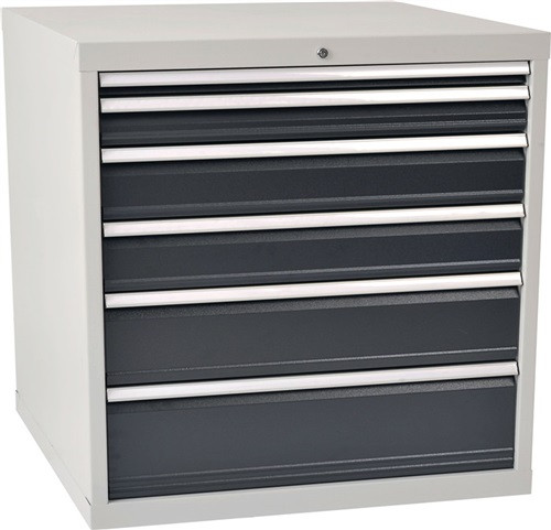 Gehäuse · Präzise Konstruktion aus hochwertigem Stahlblech · Gehäuse mit Rahmenverstärkung · Gesamttragfähigkeit 1500 kg Schubladen · Schubladen mit 100% Vollauszug · Serienmäßig mit absoluter Einzelauszugsperre und Zentralverschluss, ein Kippen des Schrankes nach vorne ist ausgeschlossen · Innen liegende Aluminium-Griffleisten vermindern die Verletzungsgefahr durch hängenbleiben · Optimale Kennzeichnung durch Beschriftungsstreifen mit Klarsichtabdeckung · Geschlitzte Seitenwände bieten zahlreiche Möglichkeiten für individuelle Unterteilungen · Schubladen-Innenmaße B 900 x T 600 mm Lackierung · Alle Schubladenschränke werden mit einer hochwertigen, und robusten Pulverbeschichtung geliefert · Weitere technische Eigenschaften Schubladeninnenbreite: 900mm • Schubladeninnentiefe: 600mm • Ausführung: Vollauszug • Anzahl Schubladen: 6 • Anzahl Schubladen x Höhe: 1 x 75, 1 x 100, 1 x 125, 1 x 150, 1 x 200, 1 x 250mm