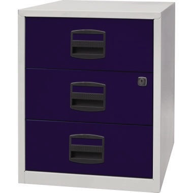 Büroschubladenschrank. Ideal für Home Office und Bereiche mit geringer Nutzung. 75 % Auszug der Schübe. Großes Etikettenfenster. · Garantiedauer: 2 Jahre · Maße: 41,3 x 52,8 x 40 cm (B x H x T) · Material des Griffes: Kunststoff · Werkstoff: Stahl · Rollen vorhanden: Ja · Schließung vorhanden: Ja · Garantie gewährt: Ja · Art der Schubladenführung: kugelgelagert · Farbe des Korpus: lichtgrau · Farbe des Griffes: schwarz · Farbe der Front: oxfordblau · Art des Auszuges: Teilauszug · Anzahl der Schubfächer: 3 Schubfächer · Form des Griffes: Griffmulde · Auszugsperre vorhanden: Nein