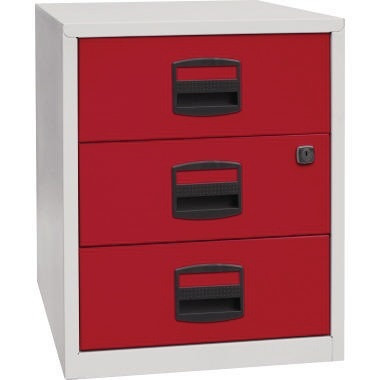 Büroschubladenschrank. Ideal für Home Office und Bereiche mit geringer Nutzung. 75 % Auszug der Schübe. Großes Etikettenfenster. · Farbe des Korpus: lichtgrau · Werkstoff: Stahl · Schließung vorhanden: Ja · Rollen vorhanden: Ja · Material des Griffes: Kunststoff · Maße: 41,3 x 52,8 x 40 cm (B x H x T) · Garantiedauer: 2 Jahre · Anzahl der Schubfächer: 3 Schubfächer · Farbe des Griffes: schwarz · Farbe der Front: kardinalrot · Auszugsperre vorhanden: Nein · Art des Auszuges: Teilauszug · Art der Schubladenführung: kugelgelagert · Form des Griffes: Griffmulde · Garantie gewährt: Ja